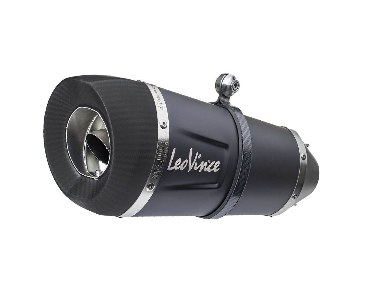 Leo Vince Slip-On til Kawasaki Ninja 1000 SX (2020-2024) - Factory S Black Edition er fremstillet med en konisk formet muffe af AISI 304 rustfrit stål, der sikrer en lang levetid og modstandsdygtighed mod korrosion. Den fulde carbon afgang tilføjer et elegant og moderne touch, mens den laserindgraverede LeoVince-logo giver et eksklusivt præg.