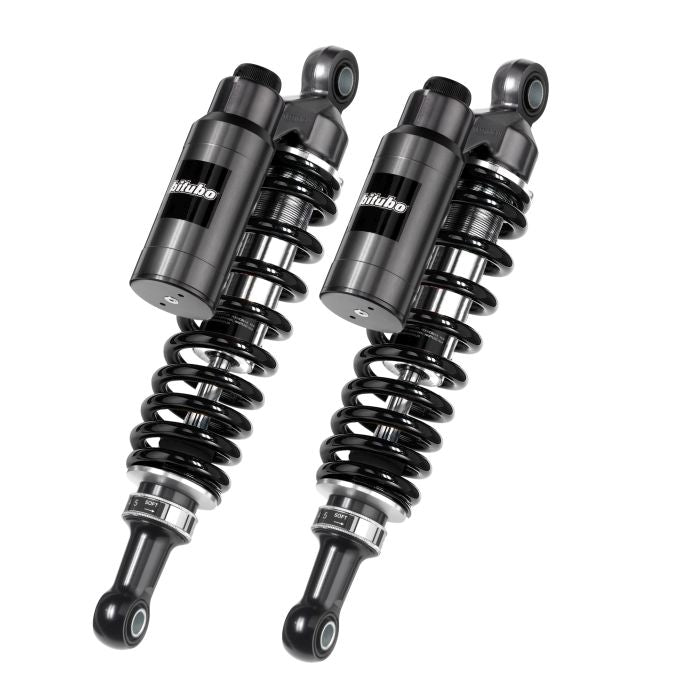 REAR TWIN Shocks - Length 376mm - Piggyback tank - ADJ:Manual spring preload, rebound, compression, length - BLACK springs