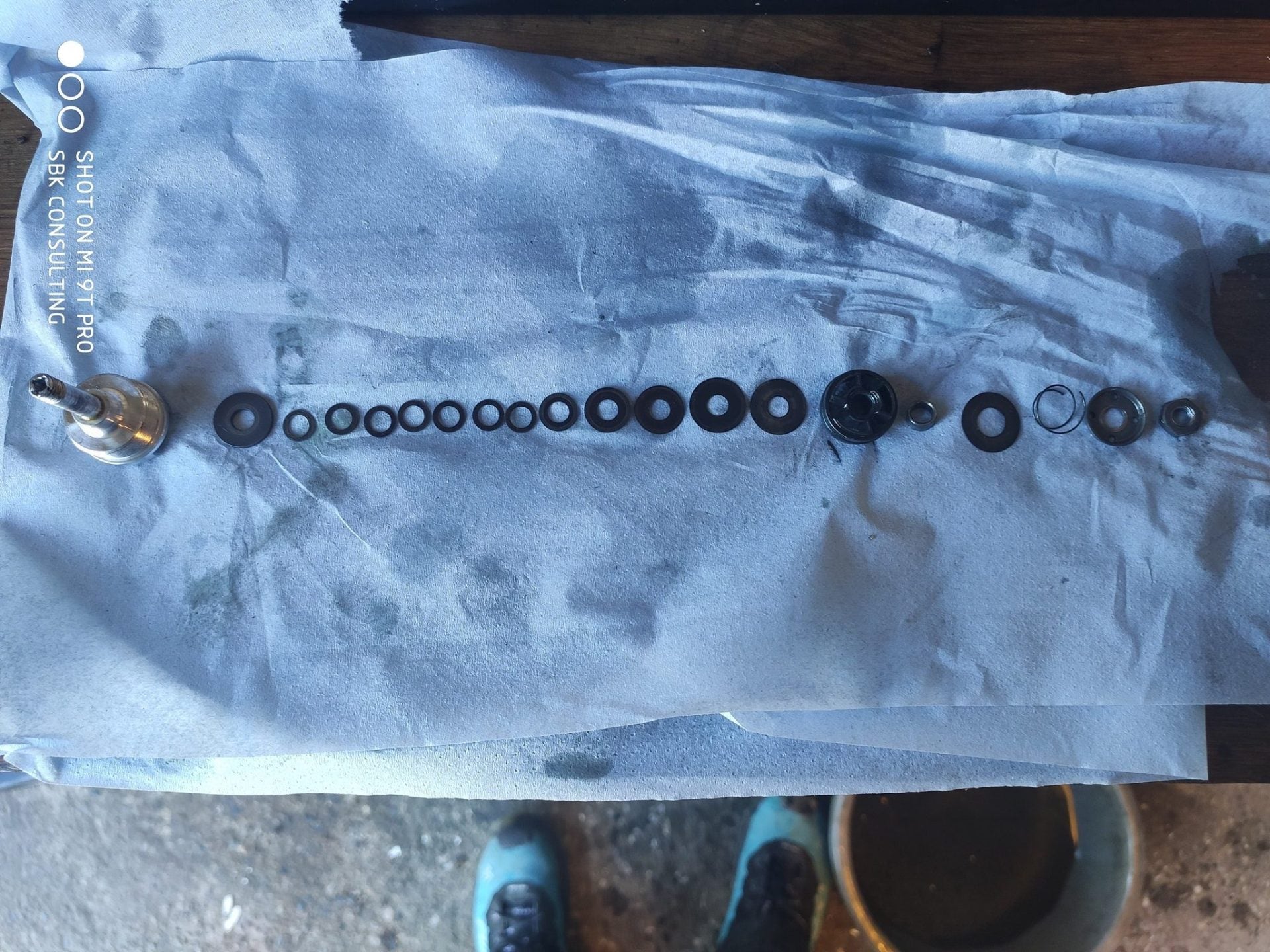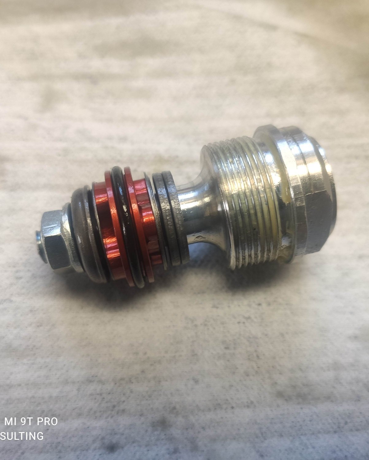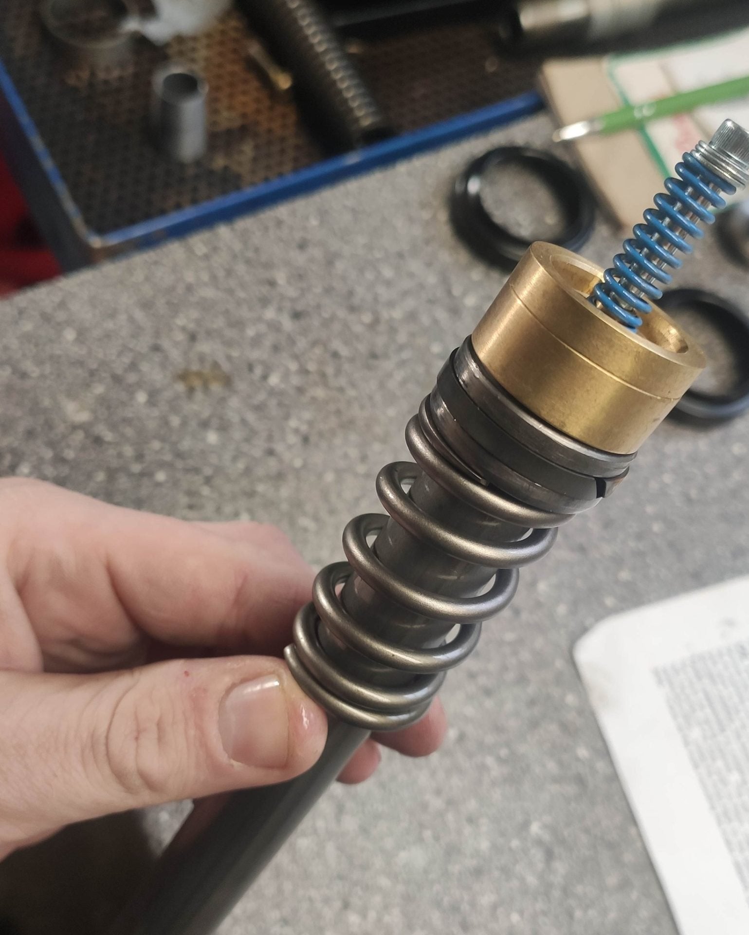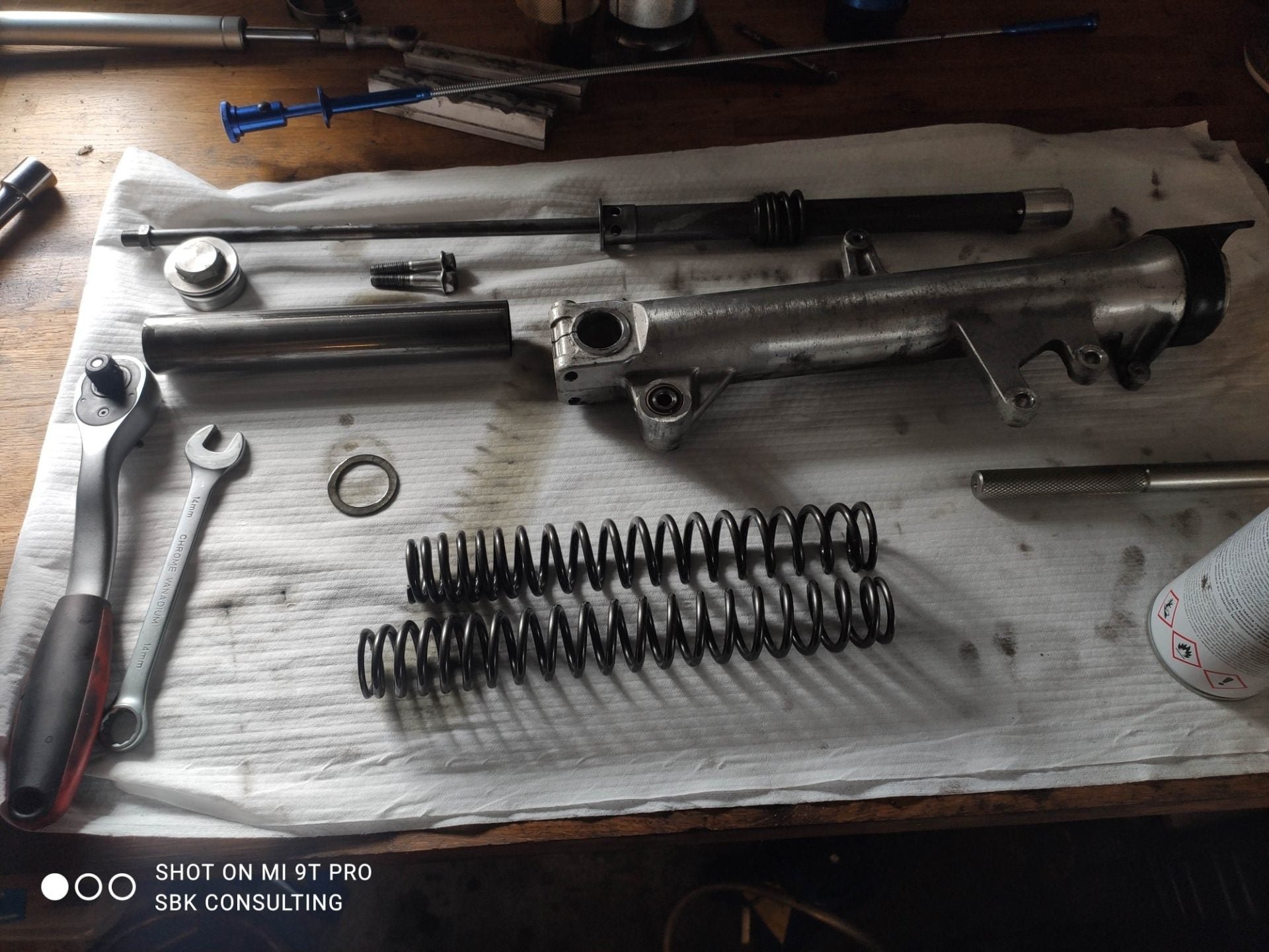 Vi skiller ALT ad, vi tjekker teflonbøsningerne for slid. Vi tjekker inderbenene for stenslag og rust, pudser dem op, hvis vi mener det er nok. Vi rengør alt, som i ALT, shimsstak, ventiler, yderben, inderben... Ja alt!