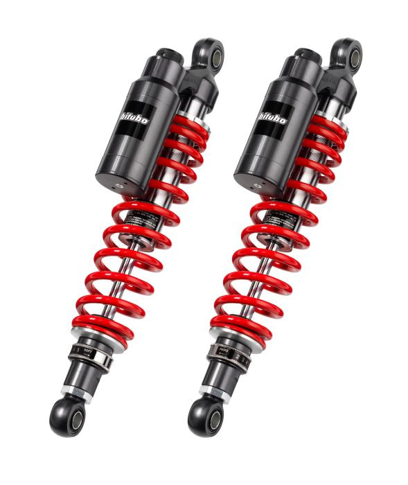 REAR TWIN Shocks - Length min 372mm, max 382mm - Piggyback tank - ADJ:Manual spring preload, lenght, rebound, compression - RED springs
